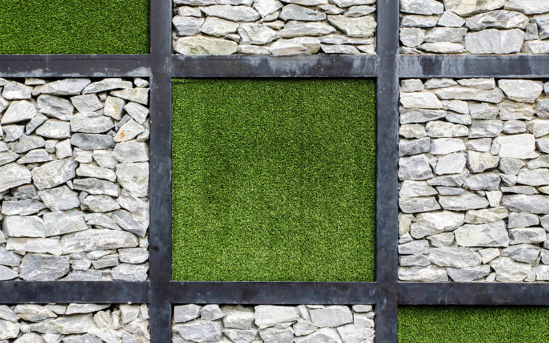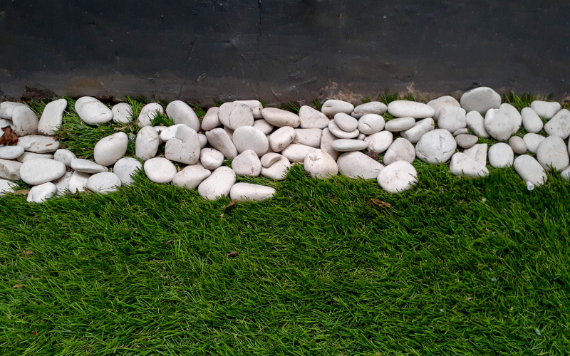 Use natural stone around artificial grass in relaxation areas to create a soothing and peaceful atmosphere. While artificial grass provides a low-maintenance surface, the natural stone surrounding it enhances the aesthetic and harmony with nature.